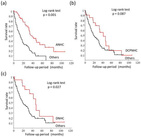 Survival analysis in higher-stage HCC (BCLC-B, C, and D). (a) Comparison between ANHC and the other patient groups. The survival rate of the patients with ANHC was significantly better than the other groups (p < 0.001). (b) Comparison between DCPNHC and the other groups. There was no difference in survival between DCPNHC and the other patient groups (p = 0.087). (c) Comparison between DNHC and the other patients. The survival rate of the patients with DNHC was significantly better than the other groups (p = 0.028).