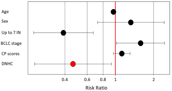 We then performed a Cox proportional hazards regression analysis, including age, sex, previously proven factors that are associated with HCC survival (Up to 7 criteria IN, Child–Pugh scores, and BCLC stage), and DNHC. The Kinki criteria was excluded because the Up to 7 criteria and Child–Pugh scores were already included in the criteria. Age, BCLC-stage, and Child–Pugh scores increased the relative risk for the survival of higher-stage HCC. The Up to 7 criteria IN and DNHC decreased the RR (Table 4) (Figure 6). DNHC was also an independent factor that was associated with the survival of higher-stage HCC.