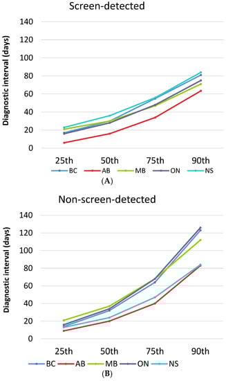 Diagnostic interval across provinces stratified by detection method. (A) Screen-detected cancers; AB = Alberta; BC = British Columbia; MB = Manitoba; NS = Nova Scotia; ON = Ontario. (B) Non-screen-detected cancers.