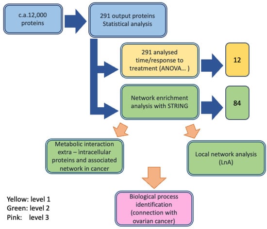First, we developed the MS study to identify the detectable proteins, their characterization, and their chemical properties such as MW and abundance. Then, statistical analyses were performed to identify the DEPs and selection criteria were applied to pass from about 12,000 proteins detected overall during the MS experiments (observations) down to 291. After subsequent selection steps that included time response (T0–T1) and PR or NR group response, 12 proteins (protein panel) were finally identified and their biological roles were described in the context of cancers/ovarian cancer pathology. Then, their profiles were studied in terms of time and response and reported in an expression profile representation. The second level of investigation was based on bioinformatic analysis of the metabolic network of the 12 identified proteins to characterize their interconnections in human cells and their localizations in cells, on cellular membranes and outside cells, by database analysis (STRING, GeneCards, Reactome and Panther). The process, first, allowed the description of a global network, then a local network around each protein of the panel was identified, and their intra-/extracellular localizations were characterized. The third level was the annotation of the biological role of each of the selected proteins in the cell response to FOLFOX-4, through metadata analysis and their connection with ovarian cancer. The workflow design is reported in Figure 1.