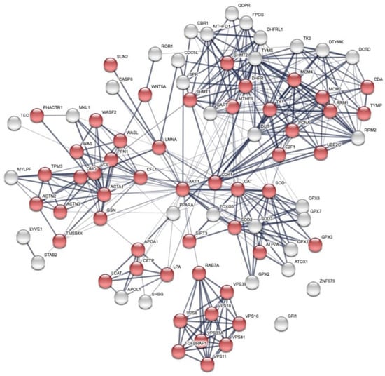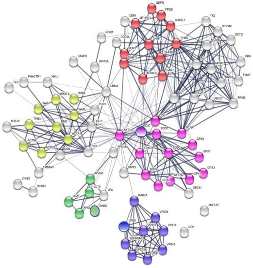 The STRING (www.string.org) [] (accessed on 2 October 2021) protein–protein interaction networks functional enrichment analysis was performed as follows: the input proteins were the 12 selected proteins plus thymidylate synthase (TYMS) and dihydrofolate reductase (DHFR). The addition of TYMS and DHFR is justified by the fact that 5-FU nucleotide targets TYMS and the TS cycle, and therefore, also affects DHFR concentrations. Leucovorin counteracts DHFR activity of the dihydrofolic acid reduction effect. The analysis settings adopted were the following: multiple proteins mode; interaction score in the range 0.400–0.700 (medium to high confidence), depending on the experiment’s objectives; all selection criteria checked, excluding neighborhood; 1st shell max 10 interactions; 2nd shell max 50 interactions; confidence mode represented by the edge thickness related to the strength of the confidence (the highest, the larger). Other specific parameters included: number of nodes, 73; number of edges, 409; average node degree, 9.86; average local clustering coefficient, 0.663: expected number of edges, 174; PPI enrichment p-value <1.0 × 10−16. We observed that by changing the parameter settings, the global network did not change regarding the main biological pathways present during the STRING enrichment process. The SOD-GPX redox biological process was always present together with the vesicles and trafficking system and the lipoprotein network.