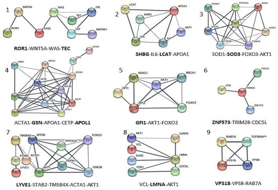 Local network interaction generated for each of the 12 proteins of the panel obtained through STRING upon elaboration of data from Figure 3 and GeneCards databases. The most relevant interconnections based on confidence feature (value of confidence >0.700 and p < 1.0 × 10−16) are also visualized in Figure 6. Each local network (1–9) shows the relevant protein connections written in the bottom, and proteins of the MS panel are reported in bold. SOD3 and VPS18, taken from Table S5a, are added as internal control proteins.