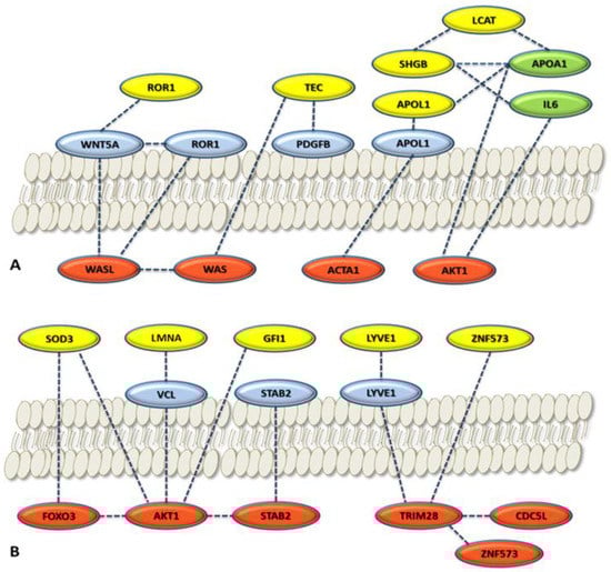 Local network connections for cytoplasmatic proteins (red), membrane proteins (blue), and serum proteins (yellow and green). The selected proteins of the panel were considered: (A) Panel proteins considered are ROR1, TEC, SHBG, LCAT, and APOL1; (B) panel proteins considered are SOD3, LMNA, GFI1, LYVE1, and ZNF573. Yellow circles, panel proteins selected; light green circles, relevant serum proteins for ovarian cancer in the network. Localization is based on GeneCards. The proteins reported not belonging to the panel come from the STRING local network analysis and GeneCards elaboration (Figure 5).