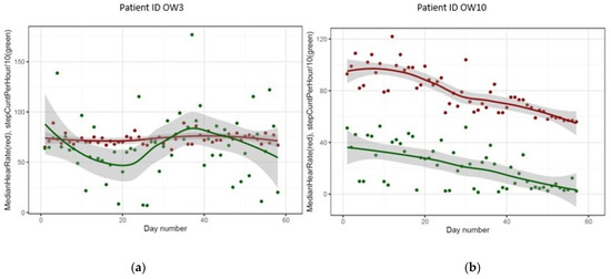 Examples of heart rate and step count variations during the study period: (a) patient ID OW3; (b) patient ID OW10.