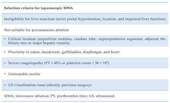 Our center’s selection criteria for laparoscopic MWA were previously described [13], in addition to the surgical procedure [14]. In particular, the laparoscopic approach is indicated when percutaneous is not feasible (Figure 1). A 14-G water-cooled coaxial antenna was inserted into the tumor under US guidance. All MWA utilized a 2.45 MHz microwave generator (AMICA GEN; HS Hospital Service SpA, Aprilia, Italy) with power settings at a median of 40 W (interquartile range (IQR), 30–60 W).