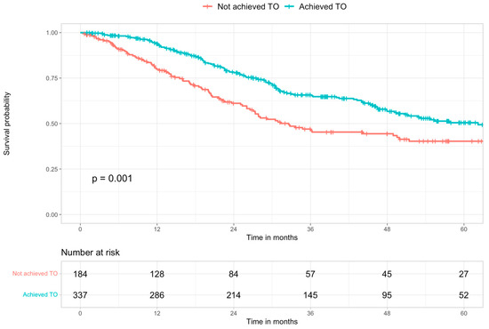 The median follow-up was 28.7 months (IQR: 14.2–49.9), and the median survival was 51.3 months (95% CI: 45.8–67.1) in the study population. The median survival in the cohort of patients who achieved TO was 62.2 months (95% CI: 49.5–not reached) compared to 32.6 months (95% CI: 27.1–51.4) in the cohort of patients who did not. The OS of patients who achieved TO was 93.9%, 65.7%, and 50.5% at 1, 3, and 5 years, respectively, compared to 1-, 3- and 5-year OS of patients who did not achieve TO that was 79.8%, 47%, and 40.3%, respectively (p = 0.001) (Figure 4).