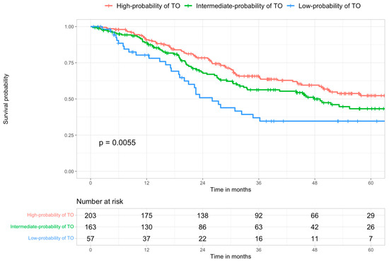 When survival analysis was performed, taking into account the risk groups stratification, the highest OS (90.9%, 65.8%, and 52.3% at 1-, 3- and five years, respectively), was observed in the group with the highest probability of TO achievement, with a progressive and significant (p = 0.0055) OS reduction, consensual to the decreasing of TO achievement probability (80.3%, 36.9% and 34.7% at 1-, 3- and 5-years, respectively, in the low-probability group) (Figure 5).