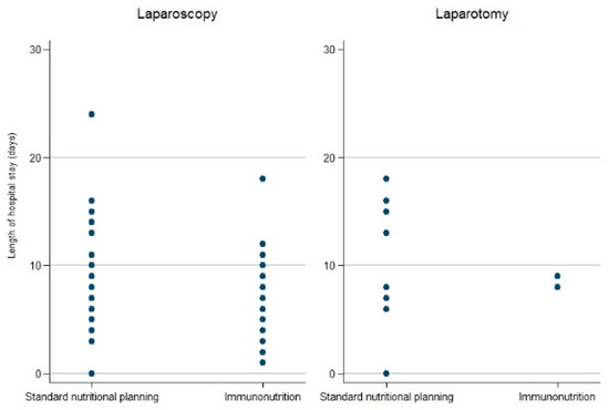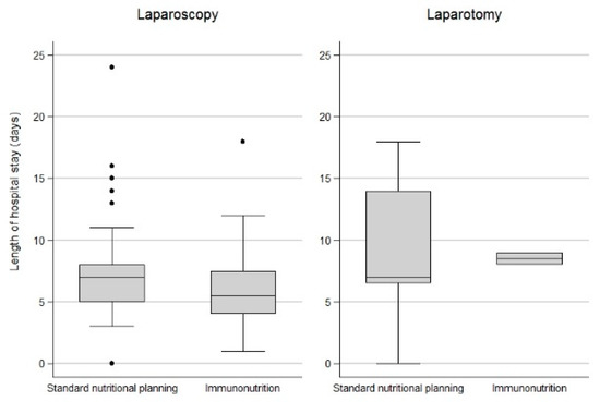 In both groups, LOS was independent of the surgical procedure (laparoscopy vs. laparotomy) (p = 0.112). Nonetheless, patients undergoing laraposcopy seem to have a shorter LOS in spite of IN (Figure 1 and Figure 2).