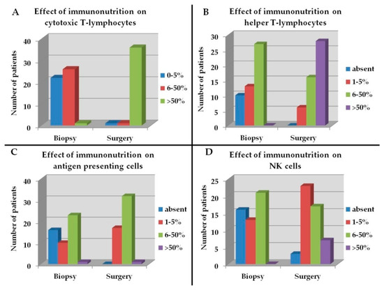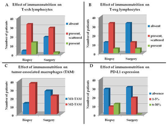 Comparing the immune function related cell indicators before (on the biopsy at the time of diagnosis) and after (on the surgical specimen) immunonutrient supplementation, we observed an increased content of CTLs, TH cells, APCs, and NK cells, reduced T-exh and T-reg phenotypes, and a M1 polarization of TAMs. Addressing check-point inhibitor pathways, we found an enhanced expression of PD-L1, suggesting an inhibitory effect on PD-1/PD-L1 axis [45,46,47,48,49,50,51].