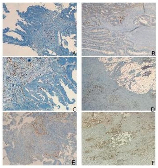 Immunohistochemistry revealed an increased number of CTL, TH lymphocytes, APC and NK cells (Figure 3A–D), a decrease of cells showing a T-exh and a T-reg phenotype, and M1 polarization (Figure 4A–C). Furthermore, both leucocytes and cancer cells showed a lower expression of PD-L1 (Figure 4D and Figure 5A–F).