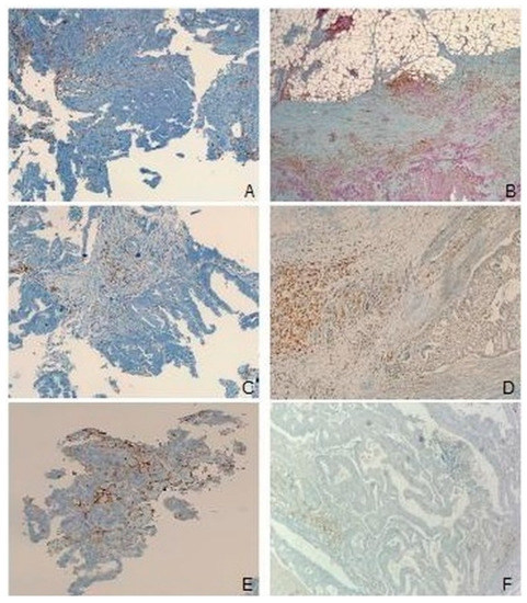 In contrast, in patients managed with standard nutrition before surgery no significant changes in infiltrating leukocytes (p = 0.5) and PD-L1 expression (p = 0.3) were noted comparing the biopsy and the matched surgical specimen (Figure 6A–F).
