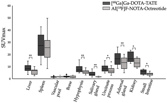 Physiological uptake (SUVmax) of [68Ga]Ga-DOTA-TATE (black bars) and Al[18F]F-NOTA-Octreotide (grey bars) in different tissues. * (p < 0.05), ** (p < 0.001).