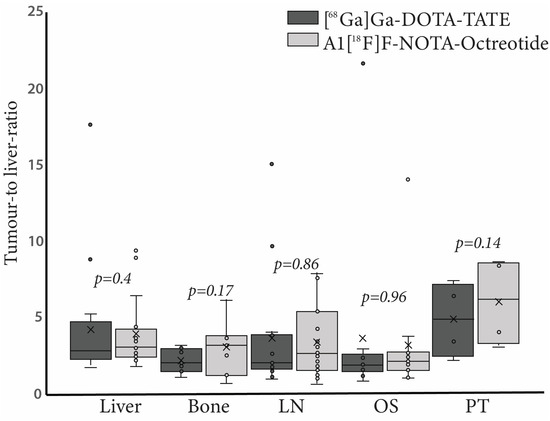 The differences between both tracers in detecting liver lesions neither change the therapeutic approach nor the disease prognosis. In fact, none of these differences was statistically significant. In other metastatic lesions such as primary tumour, bone, lymph nodes, soft tissue, ovary lung or peritoneal carcinomatosis, [68Ga]Ga-DOTA-TATE and Al[18F]F-NOTA-Octreotide had comparable effectiveness, detecting the same number of lesions.