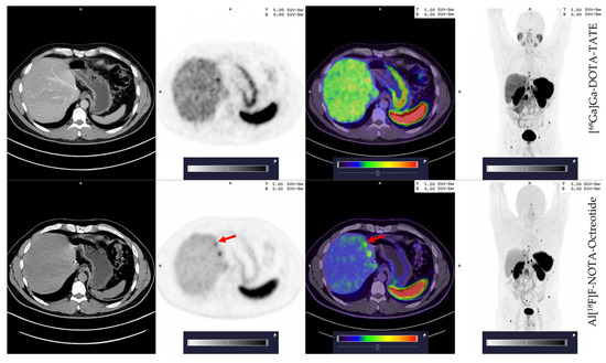 - Hou, J.; Long, T.; He, Z.; Zhou, M.; Yang, N.; Chen, D.; Zeng, S.; Hu, S. Evaluation of (18)F-AlF-NOTA-octreotide for imaging neuroendocrine neoplasms: Comparison with (68)Ga-DOTATATE PET/CT. EJNMMI Res. 2021, 11, 55. [Google Scholar] [CrossRef]