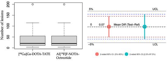 Hence, to determine a non-inferior detection of neoplastic lesions of Al[18F]F-NOTA-Octreotide PET compared to [68Ga]Ga-DOTA-TATE PET we employed a multilevel model since the results indicated evidence of clustering, confirmed by the correlation coefficient (0.68) and with a significant ANOVA test (p < 0.05). The results showed a mean difference, test-reference, of 0.074% (95% confidence interval: −3.874–4.022%) with a lower margin higher than the pre-specified boundary for non-inferiority (-5%), indicating that Al[18F]F-NOTA-Octreotide PET is non-inferior to [68Ga]Ga-DOTA-TATE PET (Figure 4).