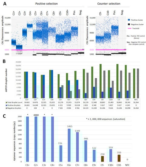 The droplets can be qualified as total, positive and negative and then counted. The accurate absolute quantification of the aptamer sequences is achieved if the total number of droplets is >10,000, so total droplet count is used as a quality assurance tool. As the selection of aptamer against HE4 moves forward, a clearer repartition into positive and negative droplets was observed after cycle 5 (C5+). As selection progressed, the number of positive droplets decreased, while negative droplet number increased, probably due to the lower amount of DNA template and with potentially more specific sequences present amplified (Figure 2B). After C5+, it seemed that many sequences were successfully amplified and detected as bound to HE4, although the number varied in each cycle throughout the selection process (Figure 2C).