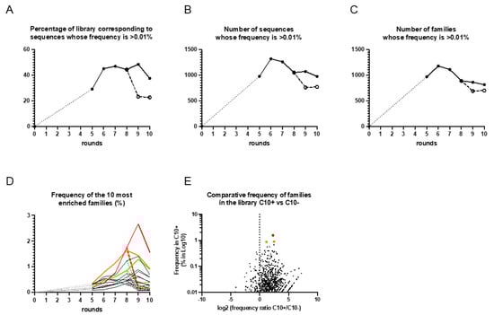 Deep sequencing analysis of SELEX. The starting library and the libraries after cycle 5 were analyzed. Sequences whose frequency is higher than 0.01% at least in one cycle were recovered and their percentage in the library as well as their number were measured for several cycles (A,B), respectively). Those sequences have been clustered in families based on an edit distance of 6. The evolution of the number of families is presented in (C). The frequency of the 10 most enriched families is presented in (D). The frequency of each family in the last C1+ cycle relative to its enrichment in the presence or absence of the HE4 protein (C10+/C10− ratio) is presented in (E). The evolution in solid lines and black dots correspond to libraries from positive selection in the presence of HE4 protein, while the evolution of dashed lines and light dots correspond to the two cycles without protein. The gray dotted lines correspond to cycles that were not sequenced. The colored curves and dots correspond to the evolution of the 3 families which were selected for binding evaluation (red, orange and green for AHE1, AHE2 and AHE3, respectively).