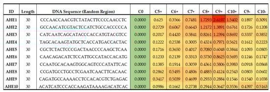 The last two positive selection steps (C9+ and C10+) to HE4 and two rounds of counter selection (C9− and C10−) to 6xhistidine peptide immobilized on Ni-NTA beads (no HE4) were performed, after equally distributing previously recovered DNA (C8+) to each branch of selection. This step is essential to identify the high-affinity sequences to ovarian cancer HE4 target, and to eliminate non-specific binders with affinity to sample matrix (no target). As the DNA is negatively charged and Ni-NTA beads are positively charged, it is expected that some aptamers could exhibit binding properties due to electrostatic interactions. Indeed, DNA was found to be amplified in both positive and counter selection. However, most importantly, a significantly higher number of aptamer sequences were present in positive selection to HE4 protein, compared to that in counter selection, suggesting high affinity and potential enrichment to target HE4 protein (Figure 2C). These conclusions were validated by deep sequencing, with specific sequences only being enriched to target HE4 and not to peptide tag or beads (Figure 3 and Figure 4).