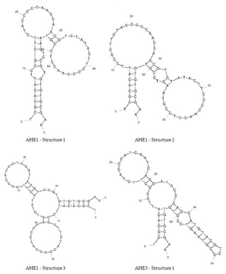 Predicted secondary structures of anti-HE4 aptamers. The secondary structures of DNA aptamers (AHE1 have three potential structures, AHE3 has one potential structure predicted) including full length 70-mer sequences were created using online DNA folding software Unafold (http://www.unafold.org) at temperature 25 °C and urine concentration of [Na+] = 55.4 mM and [Mg2+] = 4.4 mM.