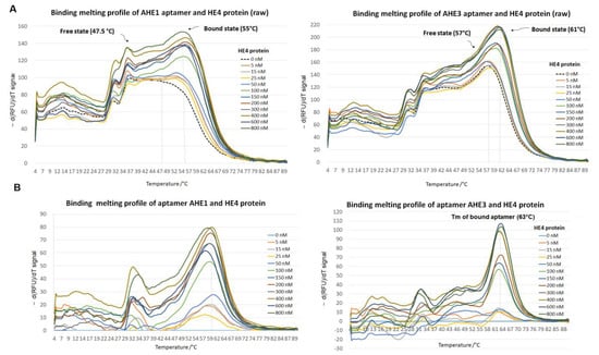 Thermofluorimetic analysis of the anti-HE4 aptamer binding to ovarian cancer biomarker HE4 in urine. The constant aptamer concentration of 100 nM was subjected to an increasing concentration of HE4 protein in urine ranging from 0 to 800 nM. The melting profile was analyzed from 4 °C to 90 °C. The binding thermal curves (melting DNA profile) were constructed by plotting temperature with negative derivative fluorescent signal −d(RFU)/dT. The results showed the average of the minimum 3 independent experiments. (A) The raw melting profile. The raw melting profile obtained for aptamers showed two distant peaks corresponding to free aptamer (no HE4) state and bound aptamer state (with HE4 protein). Upon binding to HE4 protein, more thermally stable species were present, with a shift to higher Tm. (B) The melting profile after subtraction of signal from aptamer only. After subtraction of the blank (aptamer only, no HE4), peaks of the aptamers bound to HE4 were visible, with a shift to higher Tm values, corresponding to 60 °C for AHE1 and 63 °C for AHE3, suggesting binding to target protein HE4.