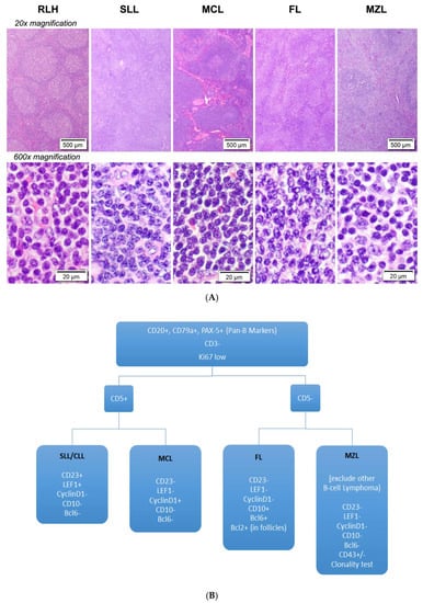 - Wang, H.-Y.; Zu, Y. Diagnostic Algorithm of Common Mature B-Cell Lymphomas by Immunohistochemistry. Arch. Pathol. Lab. Med. 2017, 141, 1236–1246. [Google Scholar] [CrossRef]