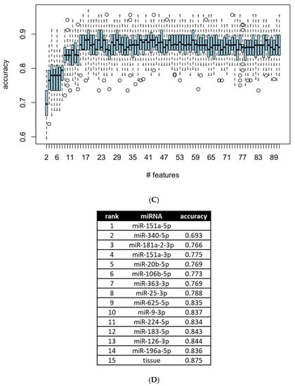 - Rosenfeld, N.; Aharonov, R.; Meiri, E.; Rosenwald, S.; Spector, Y.; Zepeniuk, M.; Benjamin, H.; Shabes, N.; Tabak, S.; Levy, A.; et al. MicroRNAs accurately identify cancer tissue origin. Nat. Biotechnol. 2008, 26, 462–469. [Google Scholar] [CrossRef]