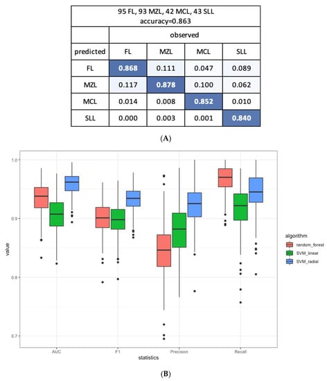 Using the combined dataset, we first developed a classification model to differentiate reactive control (RL) and lymphoma (FL, MZL, MCL, and SLL) samples. The combined dataset was subjected to 100 iterations of 4-fold cross-validation in which 3 folds were used for training and the last fold was used for testing. Support vector machine (SVM) with radial kernel was used for model training in the training datasets, and 3-fold cross-validation was performed to tune the cost parameter from 1 to 10. We applied the best-tuned model to the testing dataset, and a confusion matrix was created based on the predicted types (reactive or cancer) vs. actual samples’ types. The model’s performance was assessed by the prediction accuracy on the testing set [14].