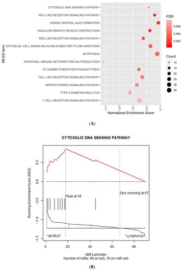 Differentially regulated pathways between lymphomas and reactive lymphoid proliferation based on deregulated miRNAs using MiRSEA analysis. (A) KEGG pathways significantly up-regulated in lymphoma compared to reactive lymphoid proliferation via miRNA regulation. (B) Cytosolic DNA sensing pathway as the most significantly enriched KEGG pathway for miRNAs de-regulated between lymphoma and RL groups. (C) Reactome pathways are significantly up-regulated in lymphoma compared to RL via miRNA deregulation. (D) Gɑ12/13 signaling events as the most significantly enriched reactome pathway for miRNAs de-regulated between lymphoma and RL groups. Abbreviations: KEGG, Kyoto encyclopedia of genes and genomes; FDR, false discovery rate.