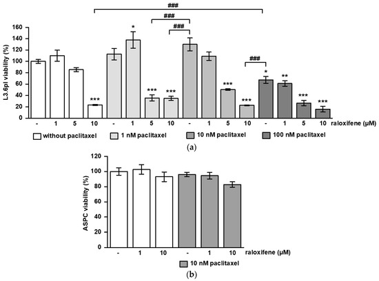 L3.6pl or ASPC cells were seeded in 96-well microplates (5000 cells/well). After growing overnight at 37 °C, the cells were shifted to serum-free conditions and were challenged in sextuplicate with raloxifene (1, 5, or 10 µM), SC144 (0.1, 0.2, 1, or 2 µM) and paclitaxel (1, 5 or 10 nM) alone or in combination for 48 h. Cell proliferation was assessed by 5-bromo-2′-deoxyuridine (BrdU) incorporation assay (Roche, Mannheim, Germany), and cell viability was determined using 3-[4,5-dimethylthiazol-2-yl]-2,5-diphenyltetrazolium bromide (MTT) assay (Sigma-Aldrich). The assays were run accordingly to the manufacturers’ protocols.