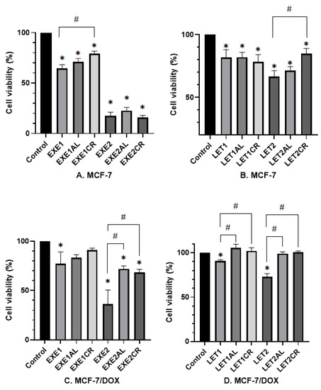 Figure 1. Effect of metalloestrogens and aromatase inhibitors in combination on cell viability. The viability of MCF-7 cells treated with exemestane (A) and letrozole (B), alone or in combination with aluminum or chromium (III). The viability of MCF-7/DOX cells treated with exemestane (C) and letrozole (D), alone or in combination with aluminum or chromium (III). EXE1 = 100 µM; EXE2 = 200 µM; LET1 = 10 µM; LET2 =100 µM; Al/Cr(III) = 100 µM. The results are presented as mean ± SD, n = 3; p < 0.05; * statistically significant difference from the control; # statistically significant difference from the aromatase inhibitor.