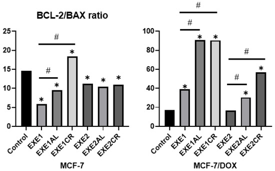 Figure 6. The effect of exemestane and its combination with metalloestrogens in the Bcl-2/BAX ratio. EXE1 = 100 µM; EXE2 = 200 µM; and Al/Cr(III) = 100 µM. The results are presented as mean, n = 3; p < 0.05; * statistically significant difference from control; # statistically significant difference from aromatase inhibitor alone.