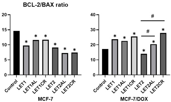 Figure 7. Effect of letrozole and its combination with metalloestrogens in the Bcl-2/BAX ratio. LET1 = 10 µM; LET2 = 100 µM; and Al/Cr(III) = 100 µM. The results are presented as mean, n = 3; p < 0.05; * statistically significant difference from control; # statistically significant difference from aromatase inhibitor alone.