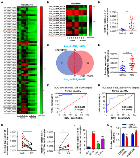 CircZBTB46 is upregulated in AML and associated with stages of AML. (A) Heatmap showing the 68 most upregulated circRNAs (p < 0.05, Log2 FC > 2.0) in GSE163386 microarray datasets. (B) Heatmap showing the 13 most upregulated circRNAs in GSE94591 microarray datasets. High values are shown in red, whereas low values are shown in green. Each column indicates one sample, and each row indicates one circRNA. (C) Venn diagram showing the intersection between the most upregulated circRNAs in the two microarray datasets. (D) qRT–PCR showing the expression of circZBTB46 in bone marrow (BM) samples obtained from nine healthy subjects and 18 AML patients. (E) qRT–PCR showing the expression of circZBTB46 in peripheral blood (PB) samples obtained from 25 healthy subjects and 25 AML patients. (F) ROC curve analysis showing the diagnostic efficiency of circZBTB46 in BM samples for distinguishing individuals with AML from healthy controls. (G) ROC curve analysis showing the diagnostic efficiency of circZBTB46 in PB samples for distinguishing patients with AML from healthy subjects. (H) qRT–PCR showing a decreased expression level of circZBTB46 in AML samples that achieved complete remission (CR) after treatment. (I) qRT–PCR showing an increased expression level of circZBTB46 in relapsed-refractory AML patients. (J) qRT–PCR showing the expression of circZBTB46 in a bone marrow stromal cell line (HS-5) and a series of AML cell lines. (K) qRT–PCR showing the expression of ZBTB46 mRNA and circZBTB46 in hematopoietic stem and progenitor cells (HSPCs) and AML cell lines. The data are shown as the mean ± SD. The p values were determined using a two-tailed paired (H,I) or unpaired Student’s t test (D,E,K), or a one-way ANOVA (J); * p < 0.05, ** p < 0.01, *** p < 0.001, **** p < 0.0001. See also Figure S1.