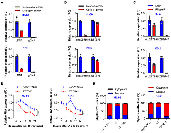 For the RNase treatment assay, 2 μg of total RNA was incubated with 3 U/μg RNase R (Epicenter Technologies, Madison, WI, USA) at 37 °C for 30 min, and RNase-free water was used as a control (Mock). The digested RNA was subsequently purified with an RNeasy MinElute Cleaning Kit (Qiagen, Germantown, MD, USA), and then qRT–PCR was performed to detect the abundance of circZBTB46 and ZBTB46 mRNA. For the actinomycin D assay, AML cells were exposed to 3 µg/mL actinomycin D (Sigma-Aldrich, St. Louis, MO, USA) to block gene transcription for 4, 8, 12, and 24 h. Then, the cells were harvested, the total RNA was extracted, and the half-lives of the circZBTB46 and ZBTB46 mRNA were analyzed using qRT–PCR.
