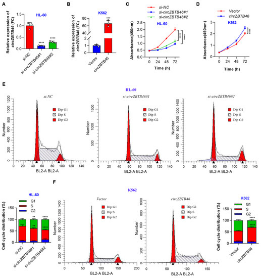 CircZBTB46 promotes cell proliferation and cell cycle progression of AML. (A) qRT–PCR showing the significant knockdown of circZBTB46 in HL-60 cells via the transfection of siRNAs. (B) qRT–PCR showing the significant overexpression of circZBTB46 in K562 cells by the transfection of the circRNA-specific lentiviral plasmid. (C) CCK-8 assay showing the proliferation ability of HL-60 cells under control conditions (si-NC) or upon circZBTB46 knockdown (si-circZBTB46). (D) CCK-8 assay showing the proliferation ability of K562 cells after the transfection of the control vector or circZBTB46 overexpression vector. (E) The percentages of transfected HL-60 cells at different cell cycle phases (G1, S, and G2) were analyzed using flow cytometry. (F) The percentages of transfected K562 cells at different cell cycle phases (G1, S, and G2) were analyzed using flow cytometry. Data were presented as mean ± SD. Two-tailed p values were determined with either an unpaired Student’s t test (B,F) or a one-way (A,E) or two-way ANOVA (C,D); ** p < 0.01, *** p < 0.001, **** p < 0.0001. See also Figure S3.