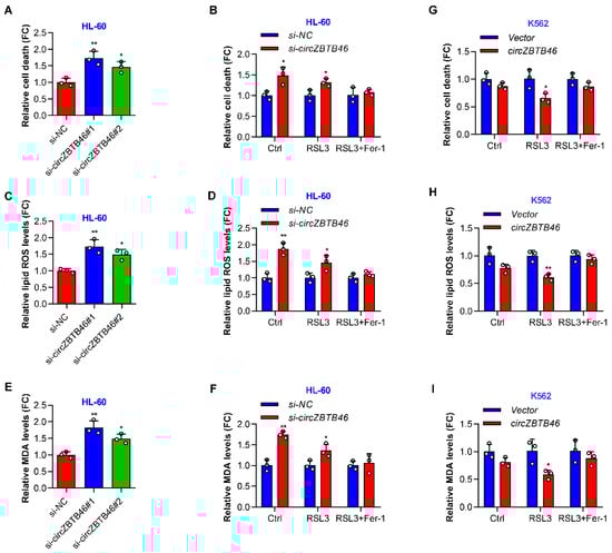 Next, we detected the lipid reactive oxygen species (ROS) to estimate the level of ferroptosis-associated lipid peroxidation in wild-type and circZBTB46-knockdown cells. The depletion of circZBTB46 increased the levels of lipid ROS in HL-60 cells (Figure 4C) and exacerbated RSL3-induced lipid peroxidation (Figure 4D). Accordingly, circZBTB46 knockdown increased the levels of malondialdehyde (MDA) in HL-60 cells (Figure 4E) and enhanced the RSL3-induced accumulation of intracellular MDA (Figure 4F), which is one of the final products of lipid peroxidation. In contrast, overexpression of circZBTB46 decreased RSL3-induced cell death and lipid peroxidation (Figure 4G–I) despite the fact that circZBTB46 overexpression alone had little effect on cell death, lipid ROS levels, and MDA levels in K562 cells (Figure S4B–D). Furthermore, the effects of circZBTB46 knockdown or overexpression on RSL3-induced cell death and lipid peroxidation could be reversed by ferrostatin-1 (Figure 4B,D,F–I). Taken together, these data indicate that circZBTB46 acted as an endogenous inhibitor of ferroptosis.
