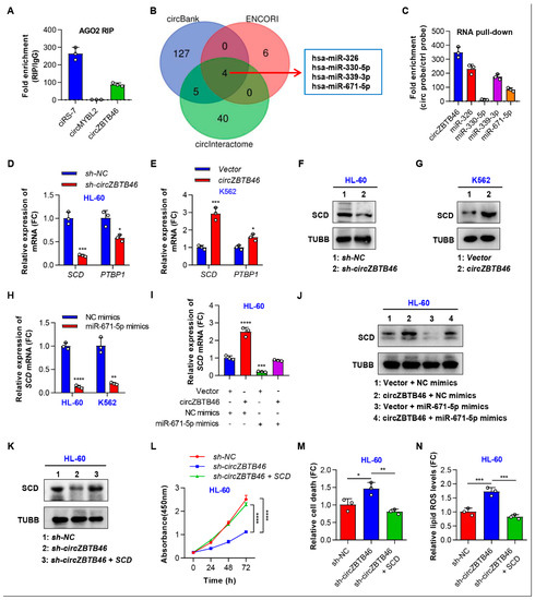 CircZBTB46 exerts its oncogenic effect by upregulating SCD. (A) qRT–PCR showing the enrichment of circRNAs in a representative anti-AGO2 RIP assay in AML cells. (B) Venn diagram showing the intersection among the candidate miRNAs interacting with circZBTB46 as predicted in three open-access databases. (C) qRT–PCR showing the enrichment of miRNAs upon circZBTB46 pull-down in AML cell lysates. (D) qRT–PCR showing the expression of SCD and PTBP1 mRNAs in HL-60 cells under control conditions (sh-NC) or upon circZBTB46 knockdown (sh-circZBTB46). (E) qRT–PCR showing the expression of SCD and PTBP1 mRNAs in K562 cells after the transfection of control vector or circZBTB46 vector. (F) Representative Western blot of SCD protein in HL-60 cells under control conditions (sh-NC) or upon circZBTB46 knockdown (sh-circZBTB46). TUBB was used as a loading control. (G) Representative Western blot of SCD protein in K562 cells after the transfection of control vector or circZBTB46 vector. (H) qRT–PCR showing the expression of SCD mRNA in AML cells after the transfection of NC mimics or miR-671-5p mimics. (I) qRT–PCR showing the expression of SCD mRNA in HL-60 cells after the transfection of control vector or circZBTB46 vector with or without NC mimics or miR-671-5p mimics. (J) Representative Western blot of SCD protein in HL-60 cells after the transfection of control vector or circZBTB46 vector with or without NC mimics or miR-671-5p mimics. (K) Representative Western blot of SCD protein in HL-60 cells under control conditions (sh-NC), upon circZBTB46 knockdown (sh-circZBTB46), or upon sh-circZBTB46 + SCD vector cotransfection. (L) CCK-8 assay showing the proliferation ability of HL-60 cells under control conditions (sh-NC), upon circZBTB46 knockdown (sh-circZBTB46), or upon sh-circZBTB46 + SCD vector cotransfection. (M) Relative cell death of HL-60 cells under control conditions (sh-NC), upon circZBTB46 knockdown (sh-circZBTB46), or upon sh-circZBTB46 + SCD vector cotransfection. (N) Relative lipid ROS levels of HL-60 cells under control conditions (sh-NC), upon circZBTB46 knockdown (sh-circZBTB46), or upon sh-circZBTB46 + SCD vector cotransfection. ROS, reactive oxygen species. The data are shown as the mean ± SD. The p values were determined with either a two-tailed unpaired Student’s t test (D,E,H) or a one-way (I,M,N) or two-way ANOVA (L); * p < 0.05, ** p < 0.01, *** p < 0.001, **** p < 0.0001. See also Figure S5.