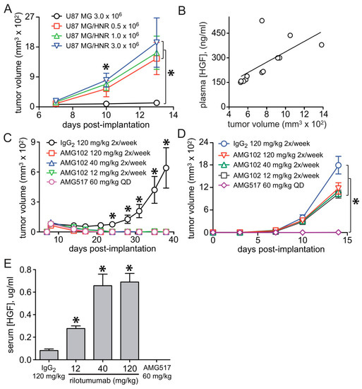 - Jun, H.T.; Sun, J.; Rex, K.; Radinsky, R.; Kendall, R.; Coxon, A.; Burgess, T.L. AMG 102, a fully human anti-hepatocyte growth factor/scatter factor neutralizing antibody, enhances the efficacy of temozolomide or docetaxel in U-87 MG cells and xenografts. Clin. Cancer Res. 2007, 13, 6735–6742. [Google Scholar] [CrossRef]