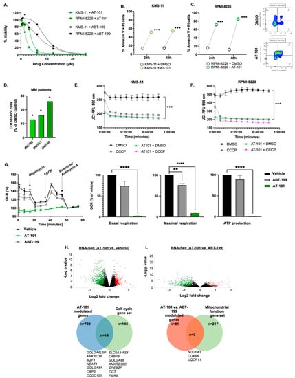 AT-101 induces myeloma cell death and compromises mitochondrial functions. (A) Multiple myeloma (MM) cell lines were treated with increasing concentrations of AT-101 or ABT-199 for 72 h and IC50 for each drug was determined by CellTiter Glo 2.0 assay. The IC50 of AT-101 in KMS-11 and RPMI-8226 cell was 3.9 uM and 2.0 uM, respectively. The IC50 of ABT-199 in these cells was 9.3 uM and 8.1 uM, respectively, which was significantly higher than that of AT-101 (p = 0.002). (B,C) MM cell lines were treated with DMSO (vehicle) or AT-101 (5 uM) for 24 h and 48 h and cell death was determined by staining with annexin-V + PI followed by flow cytometry analysis. A representative contour plot displaying cell death in RPMI-8226 cells is shown in the panel on the right. (D) Apoptosis was assessed in bone marrow mononuclear cells from MM patients treated ex vivo with AT-101 or DMSO for 24 h, followed by labeling with an anti-CD138 antibody, annexin-V and analysis by flow cytometry. (E,F) Mitochondrial outer membrane permeability was measured in KMS-11 and RPMI-8226 cells treated with AT-101 (5 uM, 24 h), which showed a significant increase in permeability (decrease in JC1 dye relative fluorescence units [RFU]) measured over a 1 h period. The uncoupling agent CCCP was used as an assay positive control. (G) Mitochondrial respiration and bioenergetics was measured in KMS-11 cells treated with AT-101 (5 uM, 24 h) or ABT-199 (5 uM, 24 h) and from which basal respiration, maximal respiration and mitochondrial ATP production was calculated. RNA-seq was performed to determine changes in transcriptome of KMS-11 cells exposed to AT-101 or ABT-199 (1 uM, 24 h). Volcano plots show genes differentially and significantly expressed between cells treated with (H). AT-101 (vs. DMSO) and (I). AT-101 vs. ABT-199. Pathway analysis was performed and identified 14 genes within the Cell cycle geneset that were differentially altered in AT-101 vs. DMSO cells (p < 0.001) and 3 genes within the Mitochondrial function geneset differentially expressed between AT-101 vs. ABT-199 (p < 0.001). Pre-/Post- plots show individual data points (each point average from a single experiment). Bar graphs show data presented as mean ± SD. Mitochondrial membrane potential Each experiment was performed three times in triplicate, except for the mitochondrial bioenergetics assay (conducted three times with 6 replicates) and those performed on primary MM samples. For apoptosis assessment in MM patient CD138+ cells, DMSO-treated samples were grouped together as “Control” and AT-101-treated samples were group together as “Treatment” and unpaired T test was applied (type 2 = two sample equal variance-homoscedastic). (* p < 0.05; ** p < 0.001, *** p < 0.001, **** p < 0.0001).