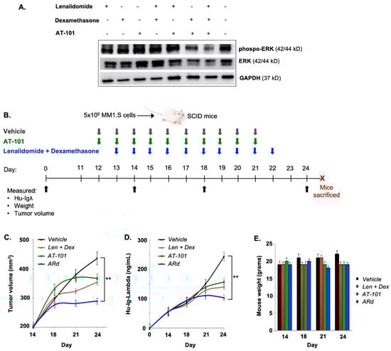 AT-101 enhances the in vivo anti-tumor effects of lenalidomide and dexamethasone in a xenograft model of human myeloma. (A) Western blot analysis for ERK and phospho-ERK (pERK) in KMS-11 cells treated with lenalidomide (1 uM), dexamethasone (1 uM), AT-101 (1 uM) or the combination (ARd) for 24 h relative to untreated cells. (B) In vivo activity of AT-101 in combination with lenalidomide and dexamethasone Female SCID mice were xenografted with human lambda light chain (Hu-Igλ) secreting MM1.S myeloma cells. Once tumors reached a median volume of ~200 mm3 (Day 14), mice were randomized to 4 groups (n = 10/group) receiving either DMSO (vehicle), AT-101 (35 mg/kg per oral gavage), lenalidomide (10 mg/kg, intraperitoneal injection) and dexamethasone (0.5 mg/kg, intraperitoneal injection) or the combination of the 3 drugs (ARd), for 10 consecutive days. (C) Tumor volume was estimated every 4 days post-randomization and reached an average of ~410 mm3 in the control group by Day 24. This contrasted with the mice that received treatment with Ld or AT-101, whose tumors grew to an average of ~330 mm3. A significant reduction in tumor volume was observed in mice treated with the ARd combination, with most mice showing little to no increase in tumor size beyond 254 mm3. (D) Next, we examined Hu-Igλ secretion in mice sera by ELISA and consistent with tumor growth pattern, we observed significantly lower Hu-Igλ levels in mice treated with LDA. (E) Notably, treatment with either AT-101, lenalidomide and dexamethasone or ARd did not result in significant weight loss or other toxicities. Data shown are mean ± SD (** p < 0.01). Uncropped WB images were shown in Figure S7.