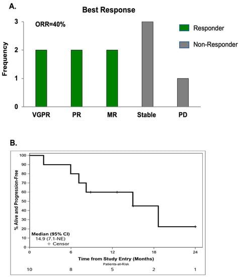 Clinical response and progression free survival (PFS) in MM patients treated with the ARd regimen. (A) Overall response rate (ORR) was assessed in 10 patients treated with ARd and was 40% (2 VGPR, 2 PR, 2 MR, 3 SD, 1 PD). (B) The median PFS for all patients was 14.9 months (95% CI 7.1-NR).