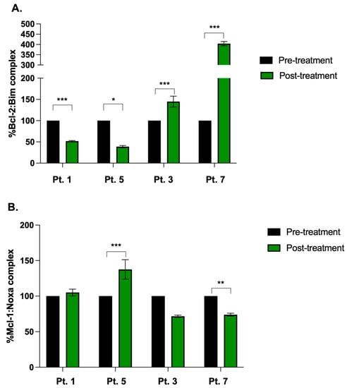 Binding interaction between anti-apoptotic and pro-apoptotic Bcl-2 family proteins in patients on ARd treatment. MSD-ELISA was performed on MM tumor cells isolated from 4 MM patients at baseline (pre-treatment) and after 2 cycles of ARd (post-treatment) showing (A) % of Bcl-2:Bim complex formation or (B) % of Mcl-1:Noxa complex formation. Data shown are mean ± standard error of the mean (* p < 0.05; ** p < 0.001, *** p < 0.001).