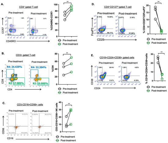 ARd therapy promotes anti-tumor immune reconstitution in MM patients. Flow cytometry was performed on bone marrow mononuclear cells isolated from MM patients who achieved >PR. Relative to pre-treatment, (A) CD4+ Th effector cells, (B) CD8+ cytotoxic T-cells and (C) NK cells were significantly increased in post-treatment samples whereas pro-tumor (D) T-regulatory and (E) B-regulatory cells were significantly decreased. Each individual data point represents a single patients’ data. ** p < 0.001.