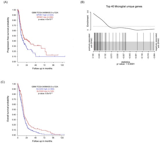 High SPHK1 expression correlates with poor survival and high microglia recruitment in GB. (A) Kaplan–Meier plot estimates progression-free survival in patients with glioblastoma divided into high and low SPHK1 expression. (B) Gene set enrichment analysis (GSEA) of microglia gene signature defined in Butovsky et al., 2014 [30] on TCGA RNAseq data of the GB dataset. The barcode plot shows the positive association between SPHK1 mRNA expression level and the top 40 microglial-unique genes. (C) Kaplan–Meier plot estimates progression-free survival in patients with glioblastoma divided into high and low SLC2A5 expression. KM analyzed using the Affymetrix 540 MASS 5.0-u133 array available in the online R2: Genomics Analysis and Visualization Platform (http://r2.amc.nl, accessed on 10 October 2022). p value in Kaplan–Meier plot results from scan modus test.