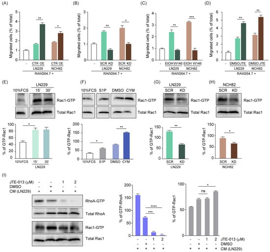 S1P acts as a chemo-attractant for murine macrophages via the modulation of Rac1/RhoA. (A,B) Chemoattraction assay of murine RAW264.7 macrophages towards human glioma cells LN229 and NCH82, either overexpressing (OE, (A)) or with knockdown (KD, (B)) of SPHK1 versus corresponding control cells (CTR and SCR, respectively). (C,D) Chemoattraction assay of RAW264.7 macrophages towards LN229 and NCH82, treated with either W146 (C) or JTE-013 (D) and corresponding solvent controls (EtOH or DMSO, respectively). Data are expressed as percent increased or decreased migration in a time frame of 6 h. (E–H) Rac1-GTP pull-down in RAW264.7 macrophages treated with media conditioned by LN229 cells for the indicated times, (E) 1 μM S1P, 500 nM CYM-5442, or DMSO control for 15 min (F). Media conditioned by LN229 (G) or NCH82 (H) cells with knockdown for SPHK1 (KD) versus the corresponding scrambled siRNA controls (SCR) for 15 min. (I) RAW264.7 cells pretreated with JTE-013 at the indicated concentrations or with corresponding solvent control and then exposed to media conditioned by LN229 cells for 15 min. Cell lysates were harvested and analyzed for active RhoA and Rac1 levels via pull-down assay. In (E–I), the percentage of active Rac1-GTP and active RhoA-GTP was calculated based on band quantification using ImageJ, and normalizing Rac1-GTP against total Rac1 or RhoA-GTP against total RhoA, respectively. CYM-5442 (S1PR1 agonist). Means with SEM are shown, n = 3, representative data are shown. ns: not significant, * p < 0.05, ** p < 0.01, *** p < 0.001, **** p < 0.0001 by Kruskal-Wallis test for (A–F,I), and by unpaired t-test for (G,H).