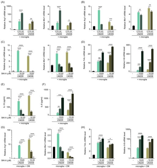 Ultimately, we adopted a syngeneic culture system where murine primary microglia were co-cultured with TU-9648 [41], a glioma cell line derived from spontaneous mouse brain tumors, in the presence of the SKI-II inhibitor or its solvent control. The analysis of M2 and M1 marker expression in this system robustly confirmed our previous observations (Figure S3L–O). Moreover, we obtained similar results when RAW264.7 macrophages were co-cultured with the murine TU-9648 cell line and treated with SKI-II (Figure S3P,Q).