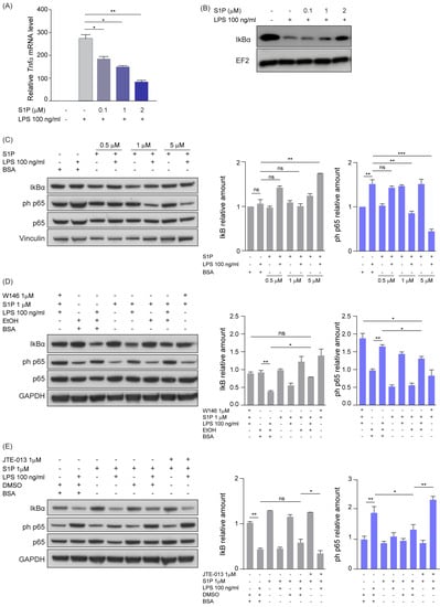 Next, we treated RAW264.7 macrophages for 1 h with LPS and increasing concentrations of S1P and performed immunoblot analyses of IkBα and the NFkB signaling mediator phosphorylated p65 (phospho-p65). As we observed a dose-dependent increase of total IκBα in the samples treated with LPS and S1P (Figure 4C), a role of S1P in limiting LPS-induced IκBɑ degradation was suggested. This effect was paralleled by a progressive decrease of phospho-p65 upon treatment with LPS and increasing levels of S1P (Figure 4C).