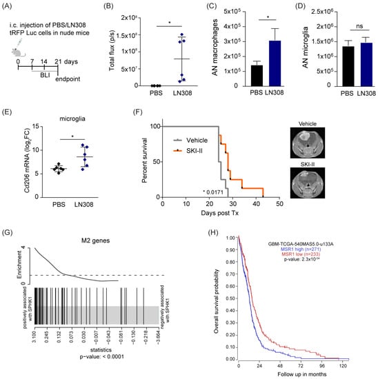 S1P is pro-tumorigenic in vivo and in human GB. (A) Schematic representation of the in vivo study. (B) Bioluminescent measurement of tumor growth at the endpoint. Intensity is expressed as total flux (photons per second). (C,D) Absolute counts (AN) of macrophages (CD11b+/CD45high/CD49dhigh, (C)) and microglia (CD11b+/CD45low/CD49dlow, (D)) as determined by flow cytometry. (E) Quantitative RT-PCR analysis of the M2 marker Cd206 in FACS-sorted microglia. The target gene was normalized to the mean of two housekeeping genes (B2m, Hprt). Data are expressed as log2FC normalized on PBS mice control. Mean with SD are shown, n = 6, ns: not significant * p < 0.05 by unpaired t-test. (F) Kaplan–Meier survival curves of mice orthotopically implanted with LN229 cells and treated with SKI-II inhibitor or vehicle (n = 8). Representative MRI images of mouse brains are shown. (G) Gene set enrichment analysis (GSEA) of the M2 gene signature as reported in Engler et al., 2012 [46] on TCGA Affimetrix data of a GB dataset. The barcode plot shows a positive association between mRNA expression of SPHK1 and the M2 genes. (H) Kaplan–Meier plot estimates overall survival in patients with glioblastoma divided into high and low MSR1 expression. Data analyzed using the Affymetrix 540 MASS 5.0-u133 array available in the online R2: Genomics Analysis and Visualization Platform (http://r2.amc.nl, accessed on 10 October 2022). p value in Kaplan–Meier results from scan modus test.