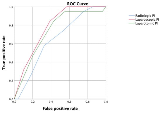 Receiver operating characteristic (ROC) curve comparing radiologic (blue line), laparoscopic (red line), and laparotomic (green line) predictive index (PI) in women who underwent primary debulking surgery.