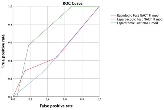 Receiver operating characteristic (ROC) curve comparing radiologic (blue line), laparoscopic (red line), and laparotomic (green line) predictive index (PI) modified for interval debulking surgery.